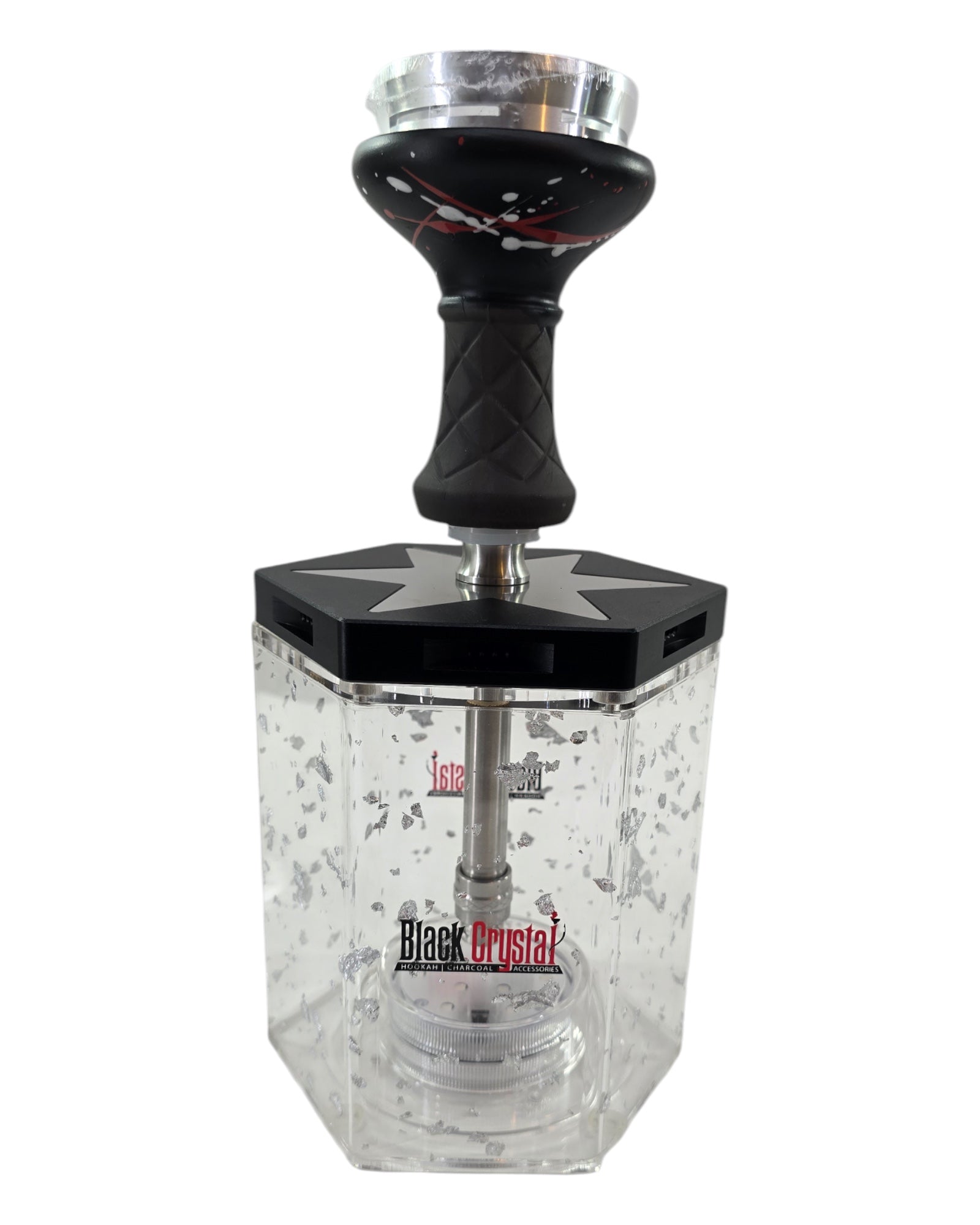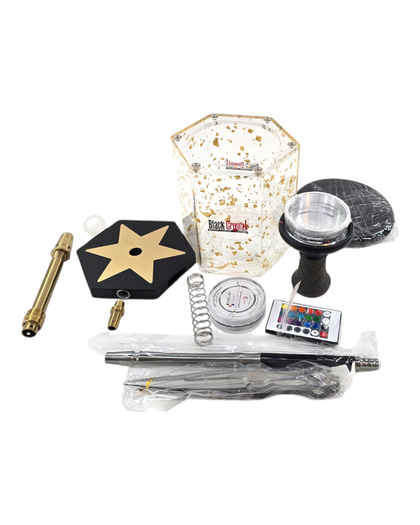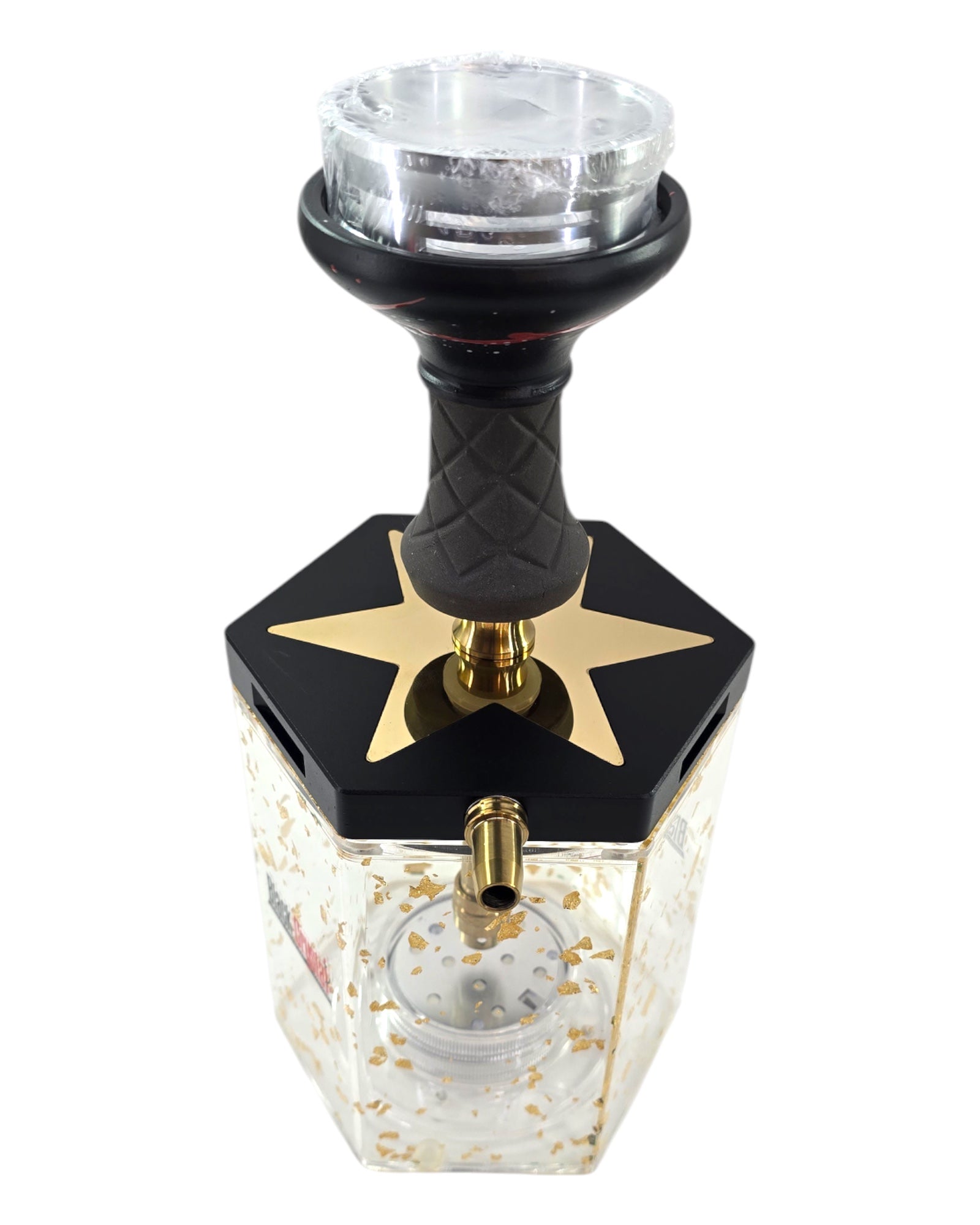 The LUNEX Hookah combines a sturdy aluminum stem with a sleek acrylic base filled with shimmering gold and silver flakes, offering a premium aesthetic. Integrated LED lighting highlights the unique flakes within the base, creating an inviting glow to enhance your environment. Designed for durability and elegance, this hookah provides a refined and immersive smoking experience.