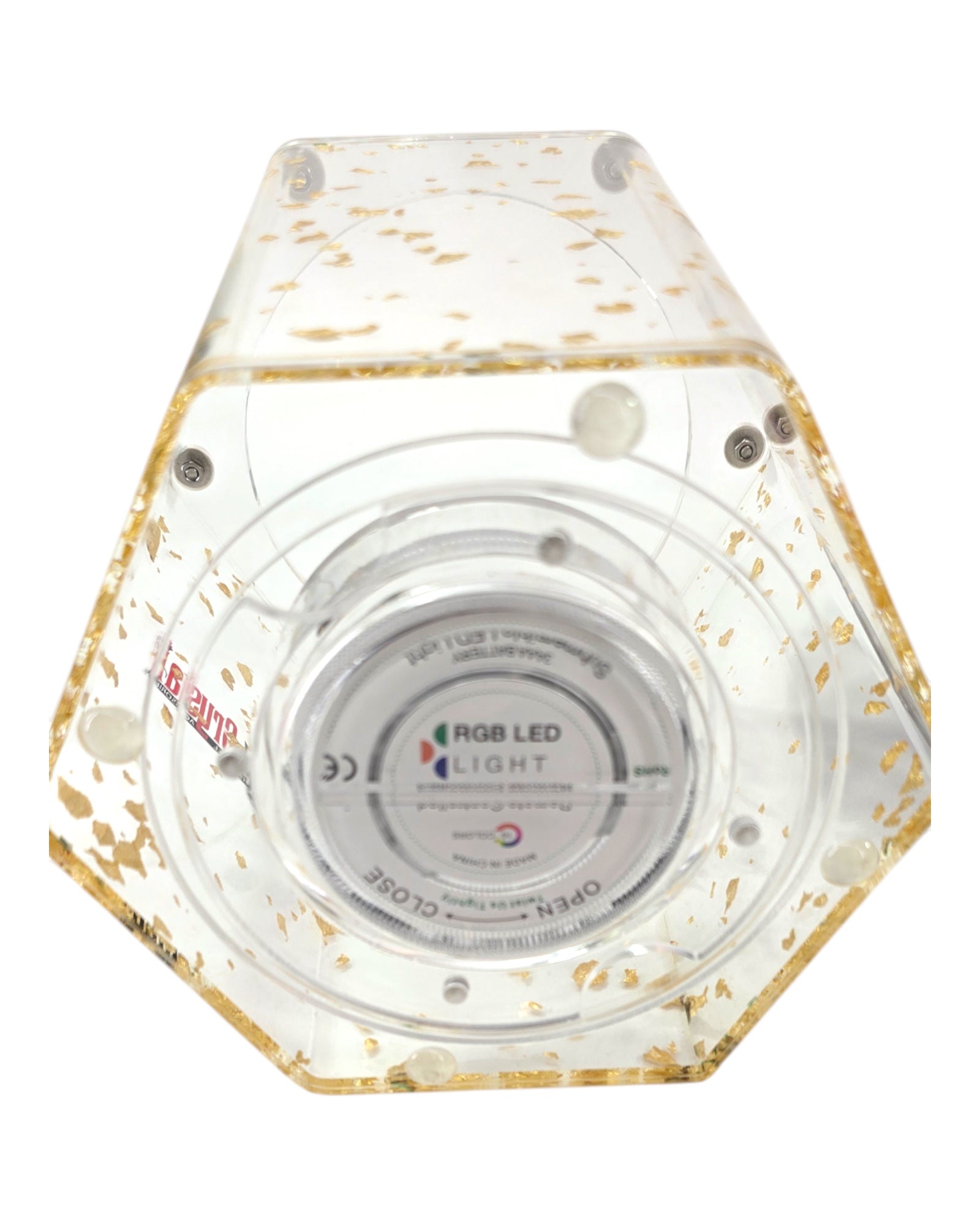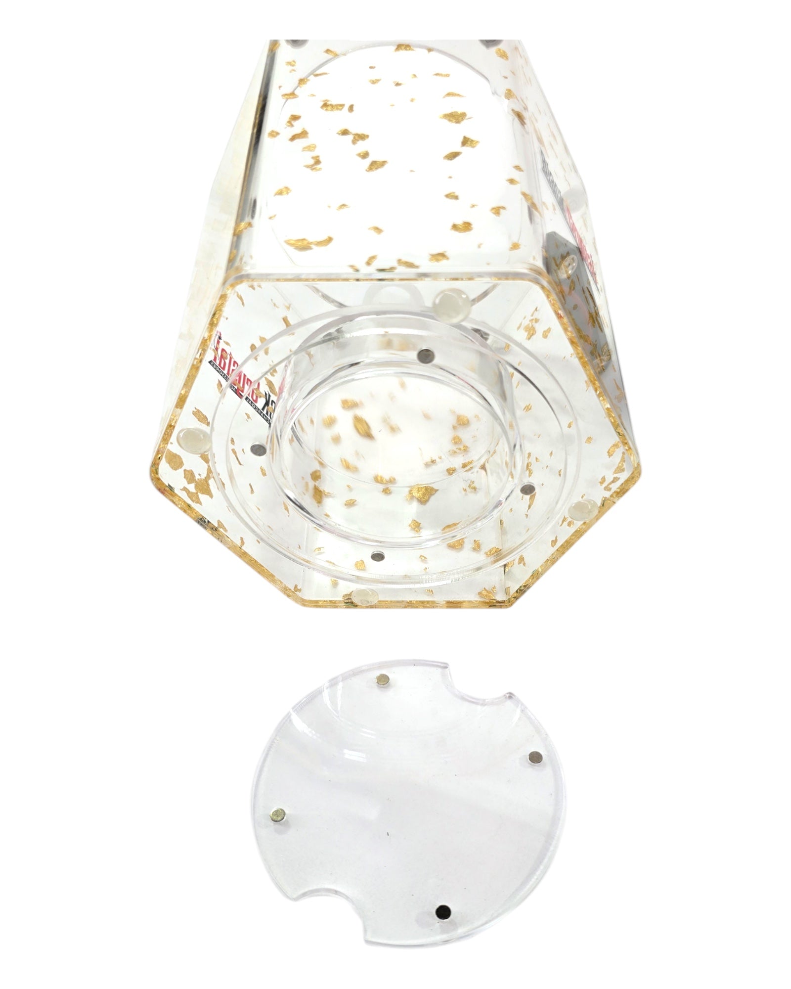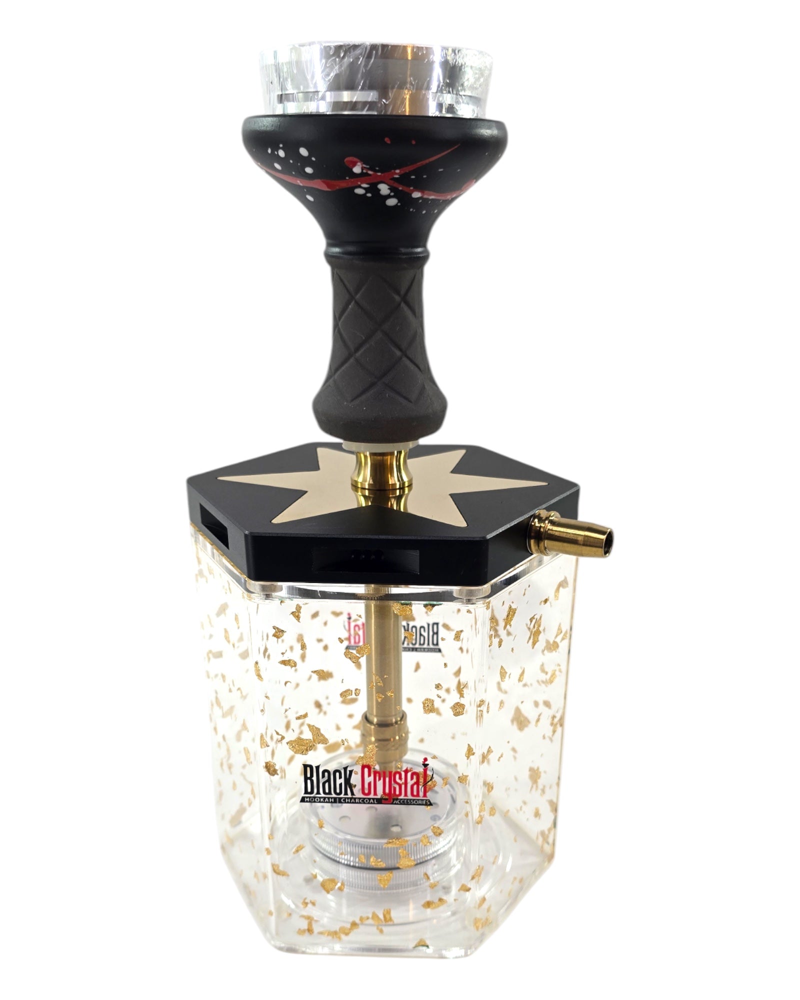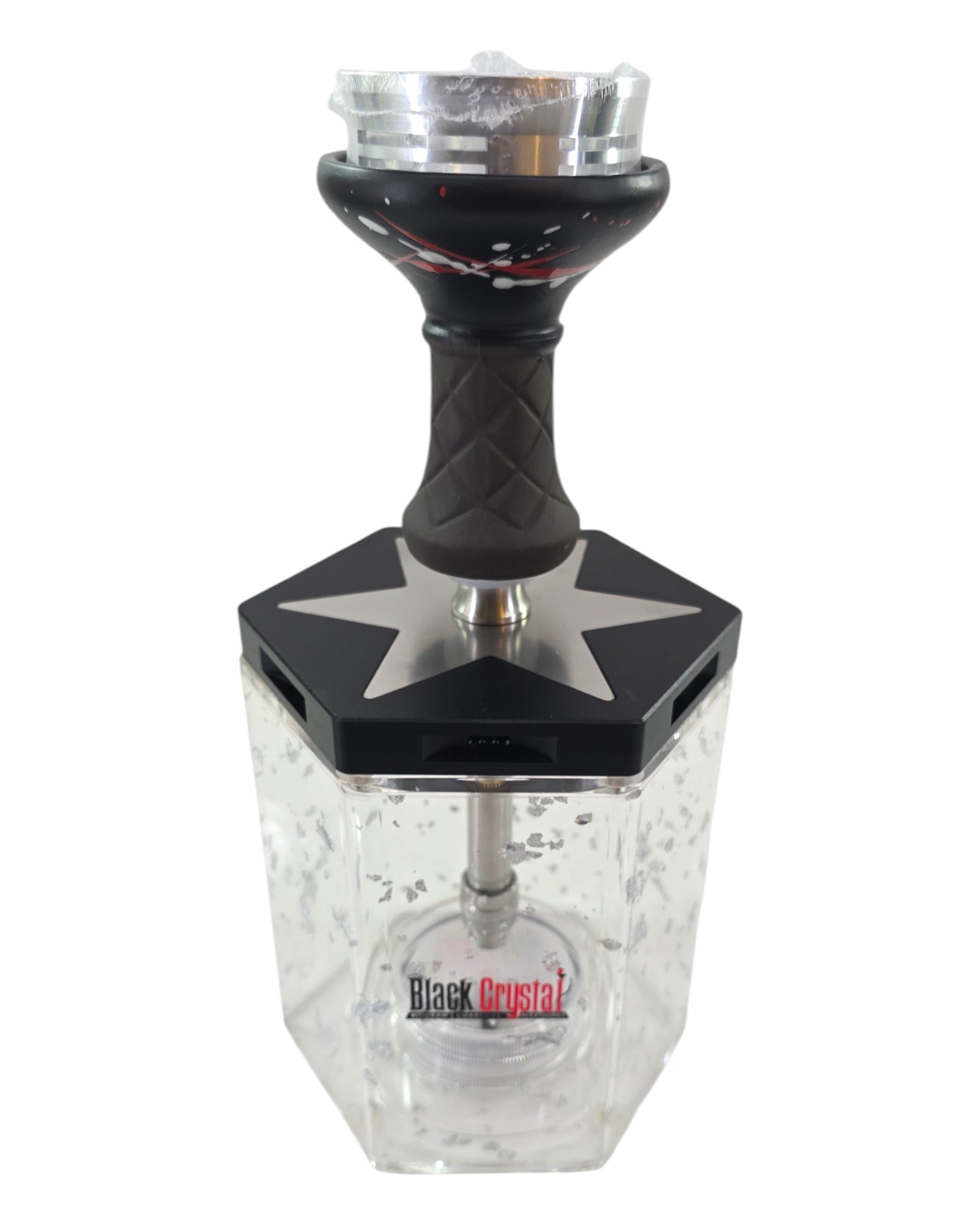 The LUNEX Hookah combines a sturdy aluminum stem with a sleek acrylic base filled with shimmering gold and silver flakes, offering a premium aesthetic. Integrated LED lighting highlights the unique flakes within the base, creating an inviting glow to enhance your environment. Designed for durability and elegance, this hookah provides a refined and immersive smoking experience.